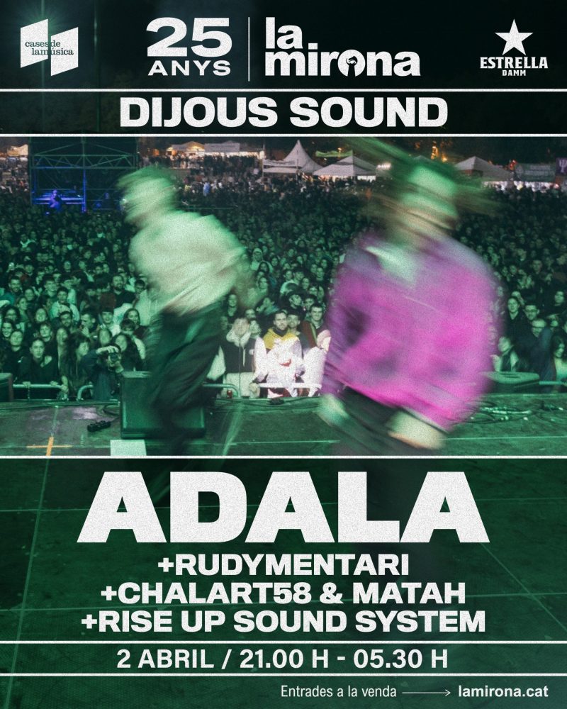 A l’escenari podrem gaudir d’Adala —en l’únic concert de l’any a la província— i de Rudymentari, que presentaran el seu nou disc. Al sound system, viurem el show de Chalart58 & Matah i de Rise Up Sound System. A partir de les 03 h sessió de Zangiff (DJ) qui ens oferirà una selecció de drum & bass.